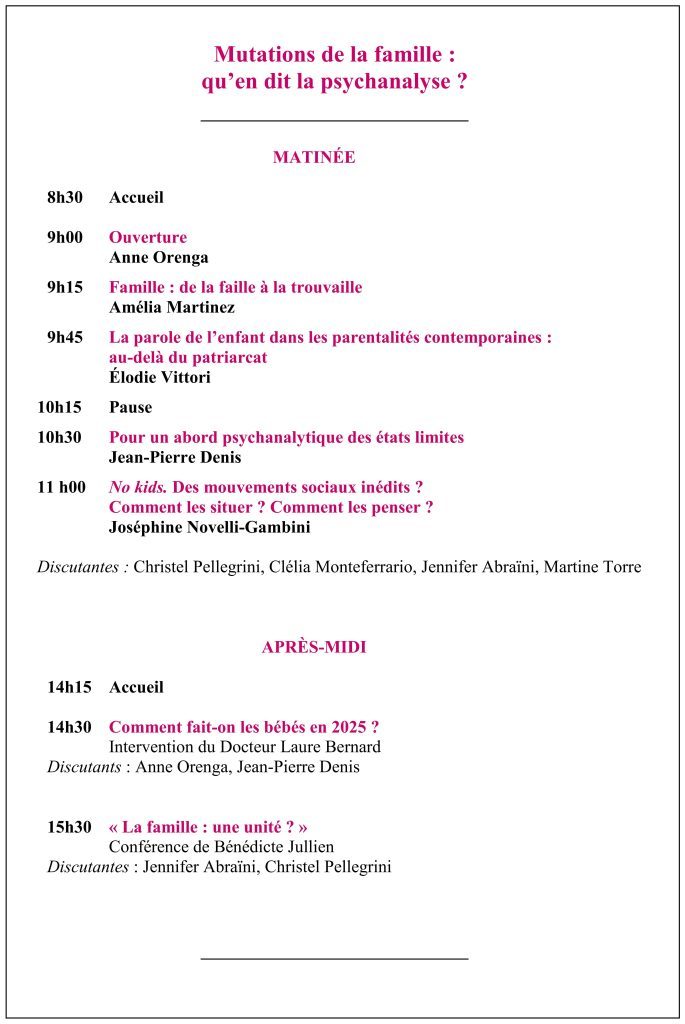 Notre colloque sera donc l’occasion de nous interroger sur la place de l’enfant dans la famille aujourd’hui, le statut de sa parole, la façon dont il a pu être désiré (ou non), quelles peuvent être les conséquences de ses symptômes sur la famille. Nous verrons comment la rencontre avec les « psys », orientés par la psychanalyse, peut permettre à chacun de trouver comment faire avec son symptôme.
